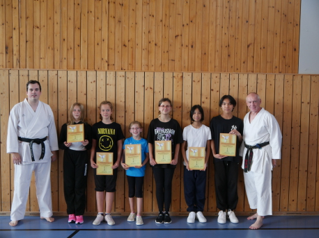 Erneut haben einige unserer Karate-Ka erfolgreich eine Prüfung abgelegt. Zum 4. Kyu erfogreich geprüft wurde Sophie Ackermann, zum 5. Kyu (beide blau) Amelie Birck. Den gelben Gürtel verdiente sich Je Wang, Weiß-Gelb ging an Sofia Zegan und gelb-orange an Aaron Maus-Delgado. Alle legten sehr passable Prüfungen hin und verdienten sich den neuen Gürtelgrad redlich.